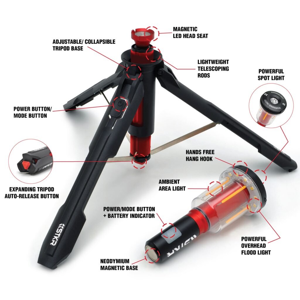 Featuring a bright white flood light that can be raised up to 28.5 inches on its telescoping tripod.